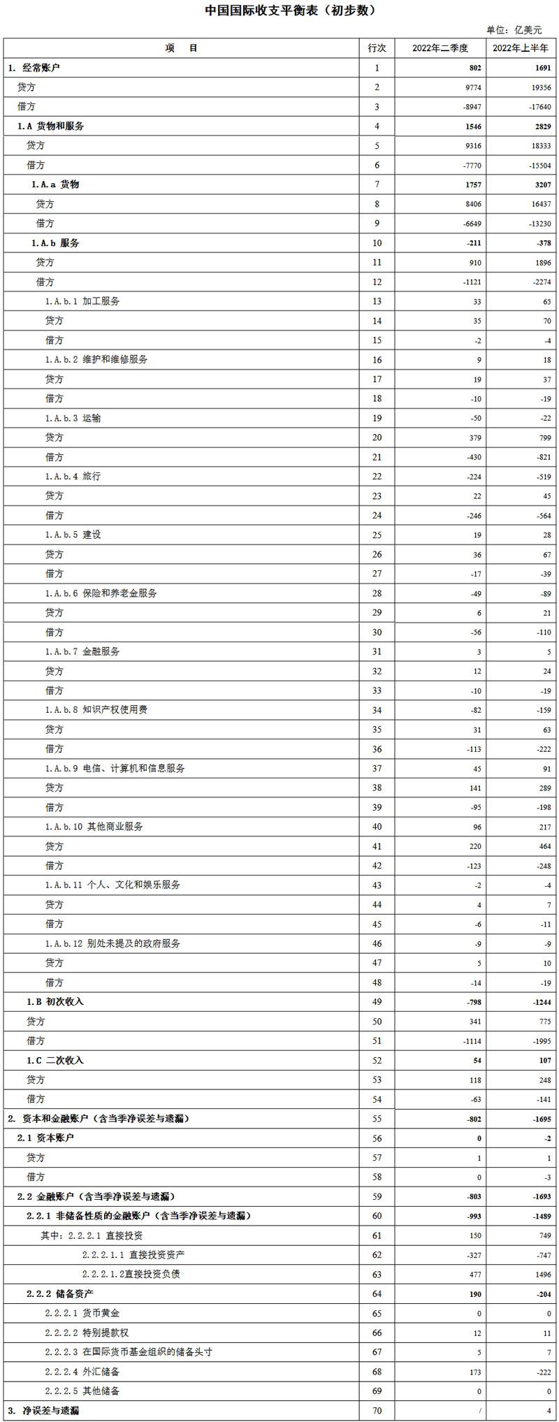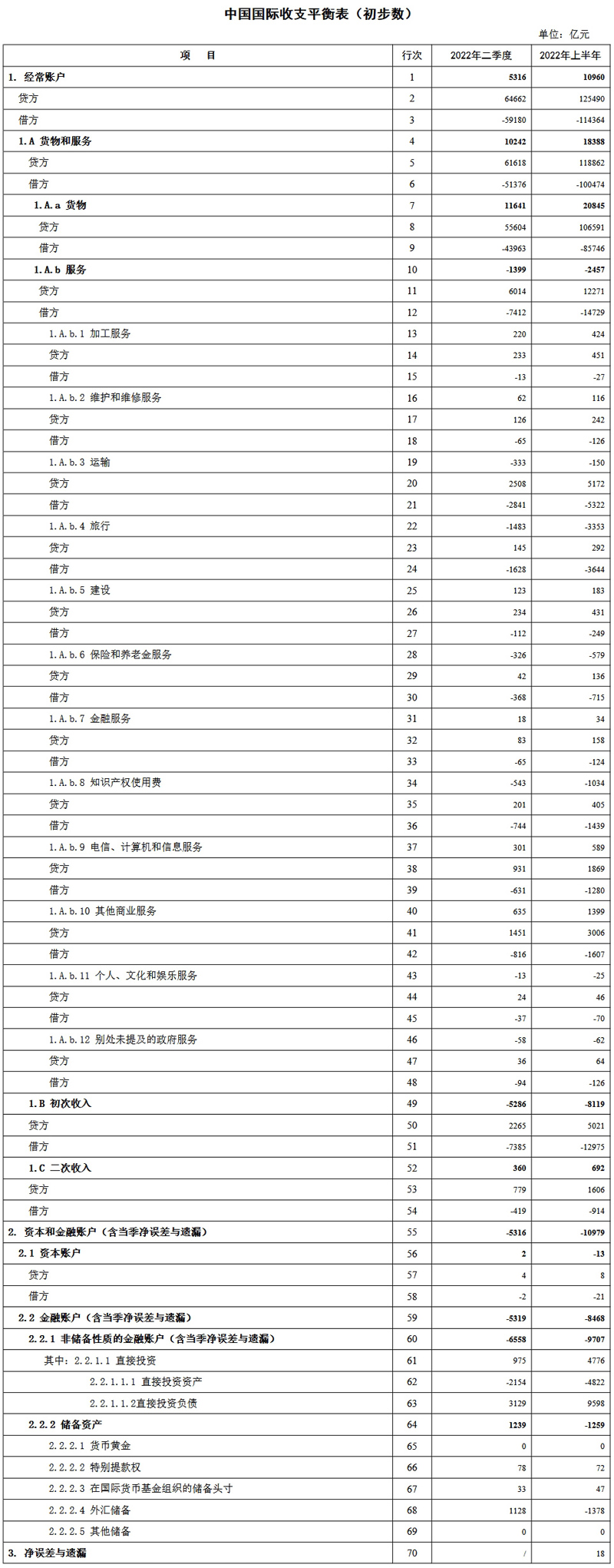 4.2022年上半年初步数为一季度平衡表正式数与二季度平衡表初步数累加得到。其中,2022年二季度初步数的资本和金融账户因含净误差与遗漏,与经常账户差额金额相等,符号相反。二季度初步数的金融账户、非储备性质的金融账户同样含净误差与遗漏。2022年一季度正式数的资本和金融账户、金融账户和非储备性质的金融账户均不含净误差与遗漏,净误差与遗漏项目单独列示。