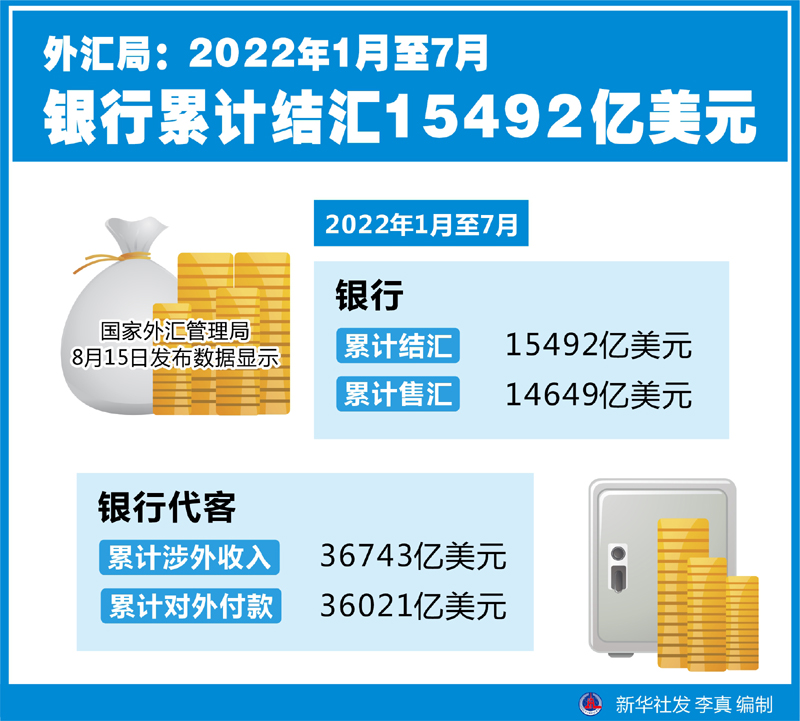 国家外汇管理局8月15日发布数据显示,今年1月至7月,银行累计结汇15492亿美元,累计售汇14649亿美元;银行代客累计涉外收入36743亿美元,累计对外付款36021亿美元。