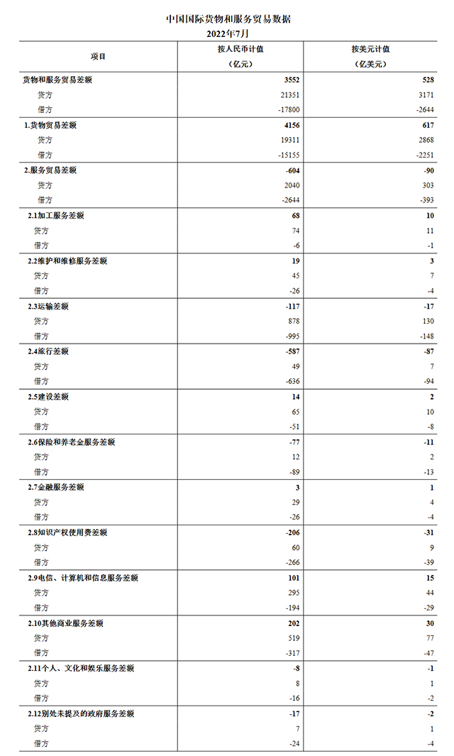 按美元计值,2022年7月,我国国际货物和服务贸易出口3171亿美元,进口2644亿美元,顺差528亿美元。